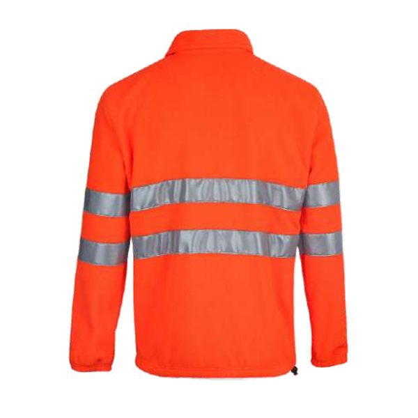 Stay warm and visible with this hi-viz polar fleece jacket featuring a front zipper, two zippered side pockets, and reflective tape for safety.