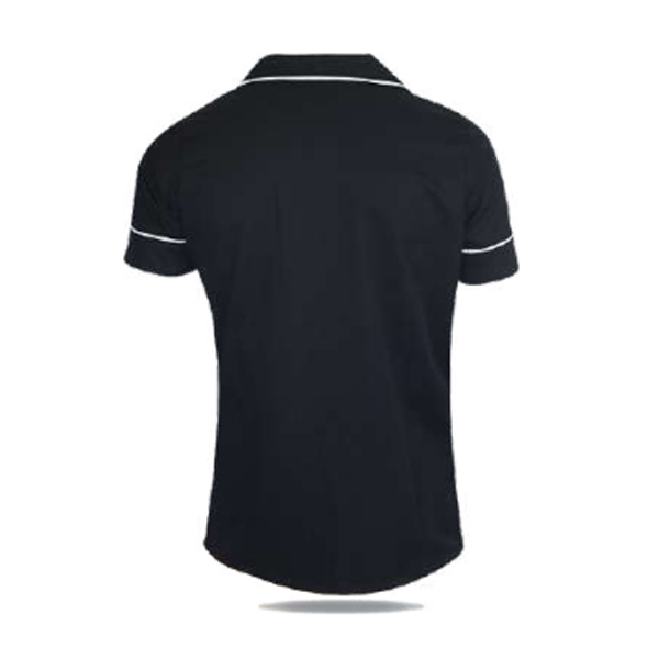 Stylish tunic shirt featuring a coat collar, contrast white piping, and two pockets with white binding. Finished with four metal ring buttons with covers, crafted from a comfortable 65% polyester and 35% cotton twill fabric.